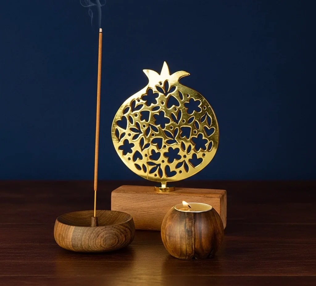 قندان انار مسی: یک قندان کوچک و دلنشین با پایه چوبی و درب مسی به شکل انار، نماد برکت و سرزندگی در فرهنگ ایرانی.