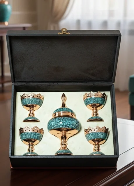 این ست شامل ظروف آجیل و شکلات خوری فیروزهای با طراحی دقیق و رنگی چشمنواز است که در جعبه بزرگ چوب و چرم نفیس قرار گرفته است. هر قطعه با دقت و ظرافت ساخته شده و جلوهای خاص و اصیل به میز پذیرایی یا هدیه شما میبخشد.
