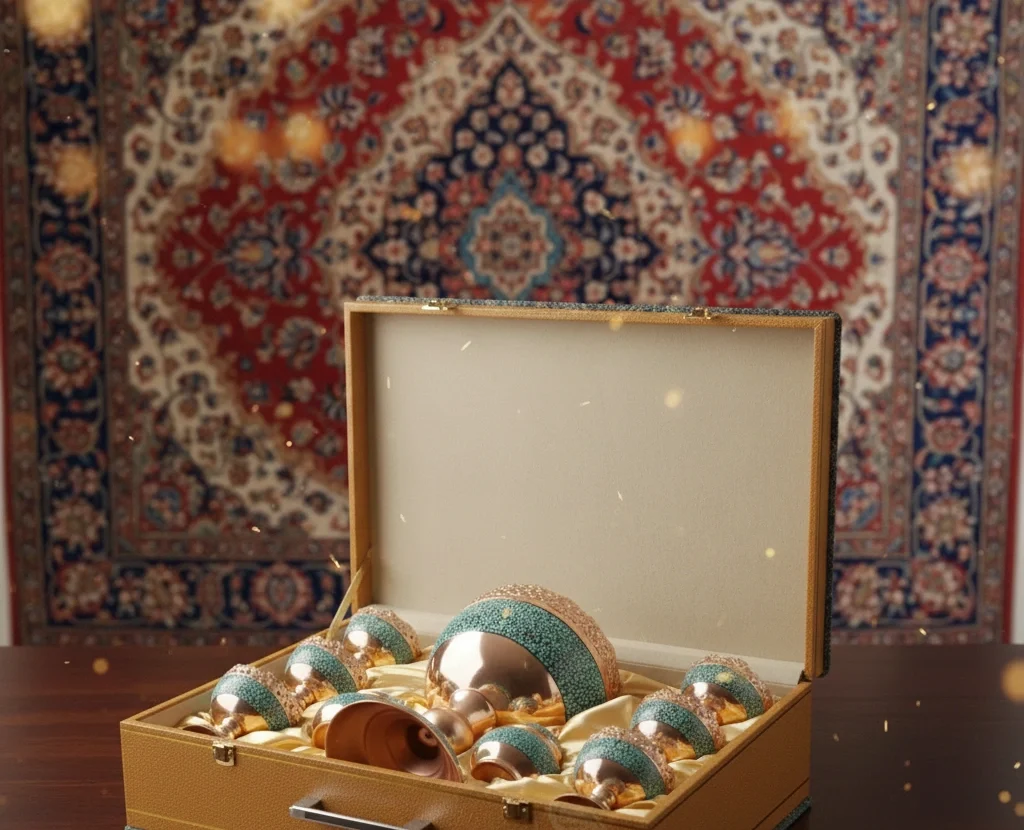 • عرضه در جعبه ترمه ضیافت ایرانی: ارائه شده در یک جعبه نفیس با پارچه اصیل ترمه ایرانی، که شکوه و جذابیت این ست فیروزه‌کوبی را دوچندان می‌کند.