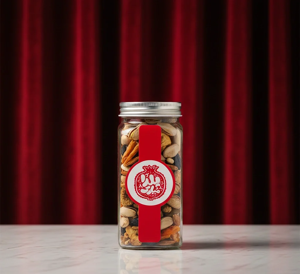 شیشه جار بزرگ با ۴۰۰ گرم آجیل یلدا؛ تازه و خوشطعم، نماد شادی و سنت یلدا.