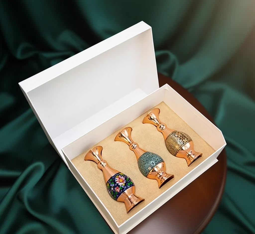 محصولات در یک جعبه هاردباکس باکیفیت و مستحکم، طرح “میهن” (به ابعاد30*20*10سانتیمتر) ارائه میشوند که خود به زیبایی و ماندگاری هدیه میافزاید.