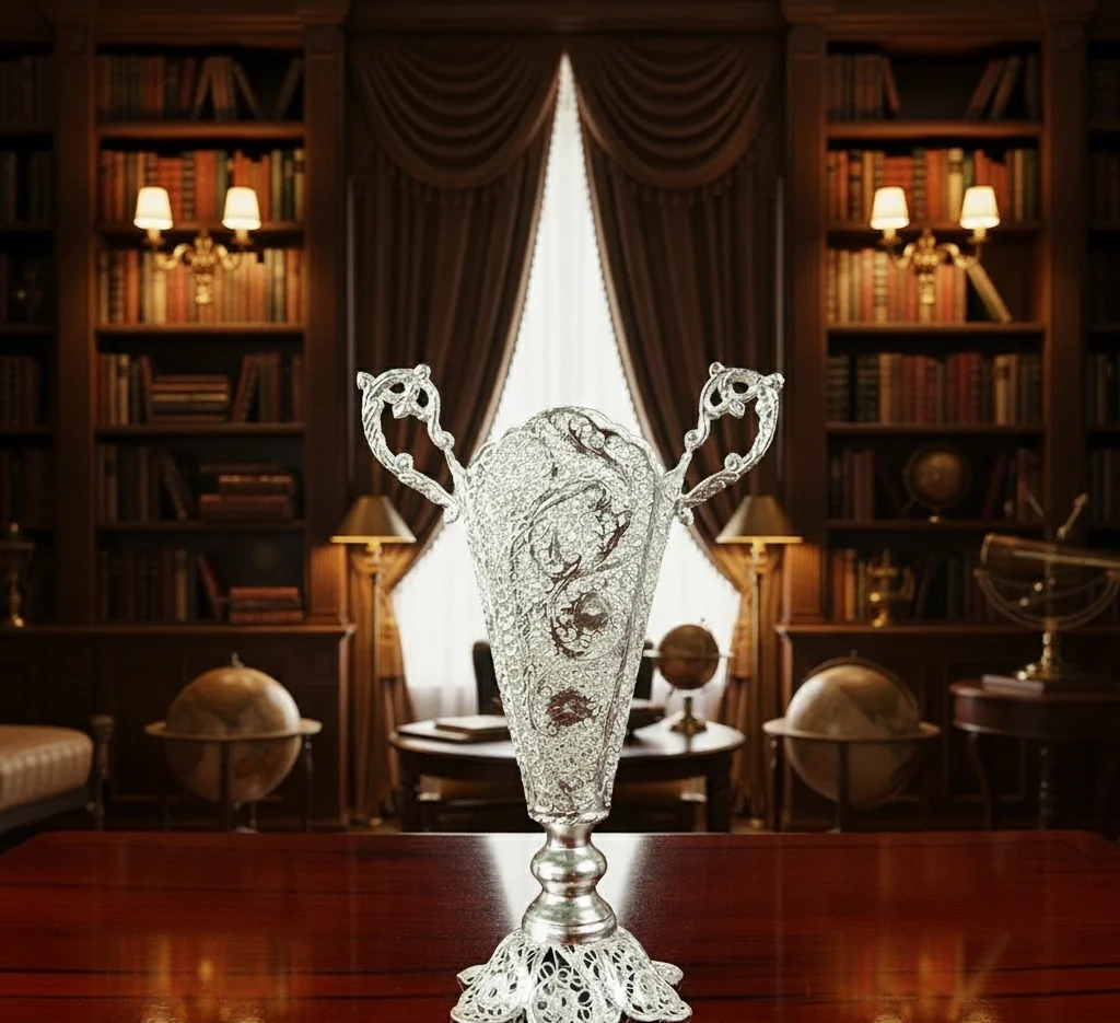 اثری خیره‌کننده با جزئیات دقیق و هنرمندانه، ساخته‌شده از سیم‌های نقره‌ای ظریف.