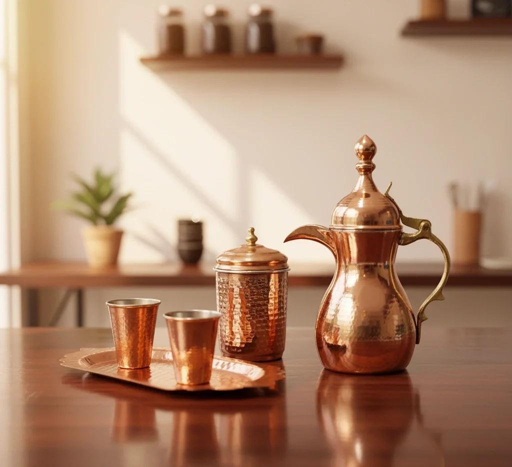 • سینی مسی: تکمیل‌کننده زیبایی و کاربرد سرو قهوه، جلوه‌ای لوکس به میز می‌بخشد.