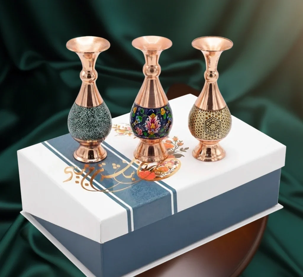 • گلدان تشعیر (مس و پرداز): سایز ۱۶ سانتی‌متر – (نماد نقوش سنتی و درخشش مس)